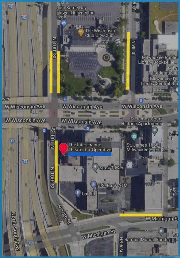 The Interchange Theater is located in Milwaukee’s beautiful and historic Westown. There are a few parking spaces available directly in front of the theater, but there are plenty of parking spaces available in the immediate area around the theater.